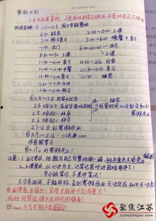 制定这份“狠强“作息时间表的是市十一中高二(3)班学生朱政,17岁的他去年9月参加全国高中数学联赛荣获一等奖。朱政告诉记者,正是因为走向了全国的舞台,才发现了自己还有很多短板,于是制定了这份寒假学习计划,警醒自己克服惰性,严格自律,打牢基础,提升自我。