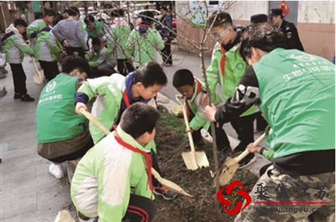 讲座结束后,大学生志愿者们和锁金二小的小朋友们携手走进社区,在鸟语花香的早春时节里,共植一棵树,为美丽金陵增添绿意。大家或三五成群,或两两结伴,自觉地组成一个个小分队。有的扶树苗,固定位置;有的拿铁锹铲土;有的脚踏土壤夯苗;有的提水浇灌树苗……大家相互协作,分工明确、有条不紊,到处都是忙碌的身影和劳动的欢声笑语。