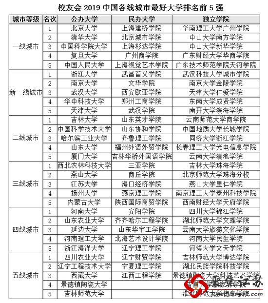 在最新校友会2019中国各线城市最好大学排名中,北京大学、浙江大学、吉林大学、西北农林科技大学、河南大学、四川农业大学分列2019中国一线、新一线、二线、三线、四线和五线城市最好大学排名冠军。上海建桥学院、武昌首义学院、山东英才学院、三亚学院、安阳学院、辽宁财贸学院分列2019中国一线、新一线、二线、三线、四线和五线城市最好民办大学排名榜首。华南理工大学广州学院、武汉科技大学城市学院、云南师范大学商学院、吉林大学珠海学院、四川大学锦江学院、吉林师范大学博达学院分列2019中国一线、新一线、二线、三线、四线和五线城市最好独立学院排名首位。