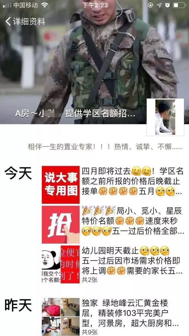 武进警方通过大量调查了解到,一个叫刘某的男子从事房产中介工作,70后,他的微信名就叫“提供学区名额”。在刘某发布的朋友圈信息中,有很多是涉及到学区入学的,例如他发的一条“广告”称:“局小、觅小、星辰特价名额,速度来秒!五一过后价格全部涨价”、“四月即将过去,学区名额之前报的价格后晚将截止接单……”、“幼儿园明天截止,五一过后市场需求价格即将上调……”。