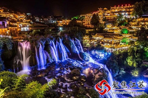 芙蓉镇的中心景观是王村大瀑布,现在也叫芙蓉镇大瀑布,它高60米,宽40米,是湘西地区最大的瀑布,分两级从悬崖峭壁处倾泻而下,场景壮观,更奇特的地方在于这条大瀑布在白天和夜晚的颜色完全不同,白天是天然白,晚上在灯光的映照下直接变成紫色,有种妖艳的迷魅感。