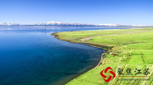 碧波万顷的湛蓝外围散布着金灿灿的亮黄,高山牧场的野花五彩缤纷,如绸似锦,数不尽的牛羊膘肥体壮,点缀其间。