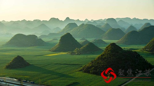 ②下午4点以后到日落。逐渐柔和的太阳光线为花海洒下一片金黄,苍黛的峰林点缀于花海中,恰倒好处地衬托出金黄的凝重。