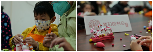 最令孩子们期待的莫过于制作兔子面塑了,活动开始前,社工老师首先向孩子们介绍了面塑的历史渊源与发展,并向孩子们展示各式各样面塑的艺术图片,伴随着阵阵“哇”的惊叹声,孩子们跃跃欲试。随后老师现场进行面塑教学,配合着实际操作,对制作面塑时不同的手法,如捏、搓、揉、刻、划等详细进行介绍,并将提前准备好的制作材料分发给参与活动的每个小朋友。通过通过揉、搓、捏、切、刻、划不同手法,每个孩子都塑造出了属于自己的“小兔子”。孩子们的成就感也立马拉满。