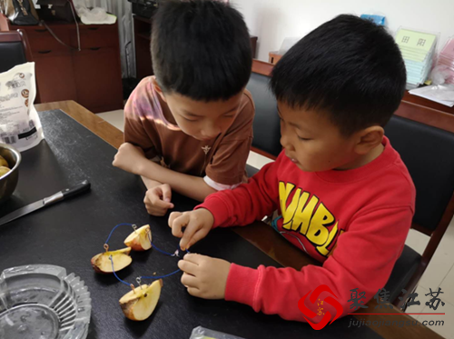 在大致了解到实验的基本步骤后,小朋友们开始动手制作水果电池。现场,小朋友小心翼翼地为苹果插上铜片和锌片,并用导线将其与小灯泡相接,如此反复三四次后,小灯泡亮了起来。虽然光很微弱,但足以照亮小朋友们探索科学的道路。