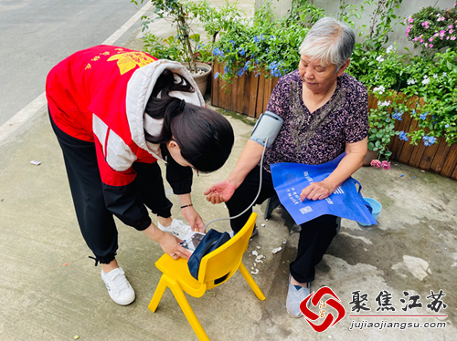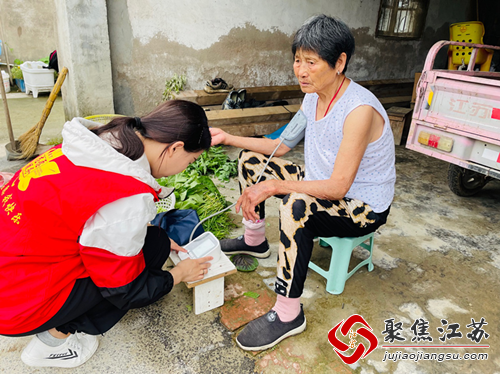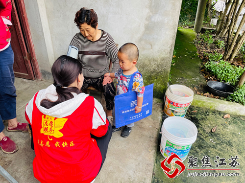 慰问现场,周里村新时代文明实践站的志愿者给他们读书,读新闻,告诉他们最近的天气,同时提醒他们注意天气,多注意点身体状况。