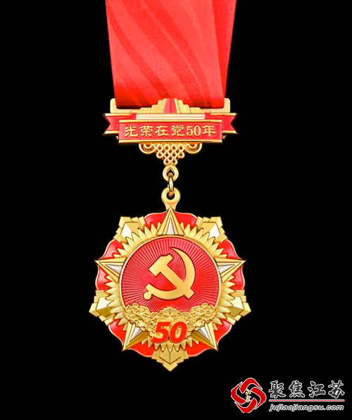 “光荣在党50年”纪念章是党中央2021年首次颁发给党龄达到50周年、一贯表现良好的党员。纪念章通径50毫米,材质为铜和锌合金,主色调为红色和金色。2021年3月,经党中央批准,中央组织部印发了《“光荣在党50年”纪念章颁发管理办法》,对纪念章的颁发程序、颁发方式、制作、管理等作出规定。