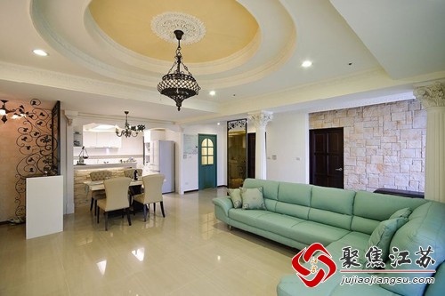 空间不规则的客厅最好摆放可以灵活组合的沙发,以应付不规则形状所带来的客厅空间浪费。如果不规则为长扁型空间,可以选择L型沙发或两人沙发搭配。