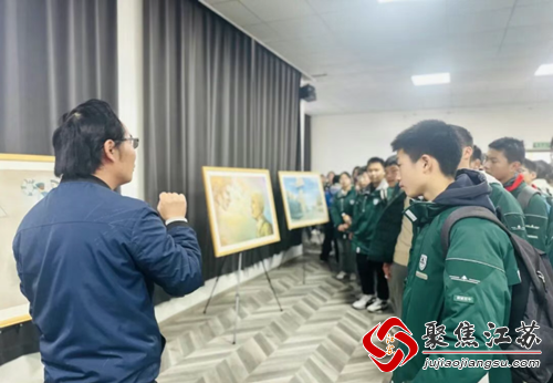 这座始建于1934年的工厂,曾是近代中国规模最大、设备最先进的水泥厂之一,被誉为“中国水泥工业的摇篮”。在讲解员的带领下,同学们集中观看红色历史影片,直观感受抗战时期工厂庇护难民、支援抗日的峥嵘岁月,银幕上的珍贵影像让爱国情怀在心中悄然扎根。随后,在数媒英雄人物“永远的黄玫瑰:1937辛德贝格在南京的106 天”主题系列绘画展内,一幅幅生动的作品再现了当年工厂生产、难民救助的场景,同学们驻足凝视,仿佛穿越时空,与那段热血历史隔空对话。