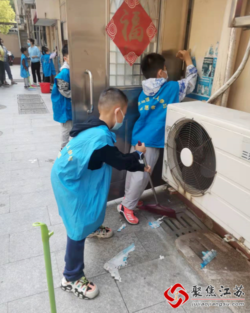 上午九点,在社区掌云群里成功报名的18位青少年早早来到了三角新苑小区。大家穿上统一城市治理的蓝色志愿者马甲,有拿拖把拖楼道的,有拿抹布擦楼梯扶手的,还有拿铲刀清理小广告的……他们不怕脏,不怕累,分工明确,个个干劲十足。部分小小志愿者工作能力强,一个下午清洁了好几个单元的卫生。