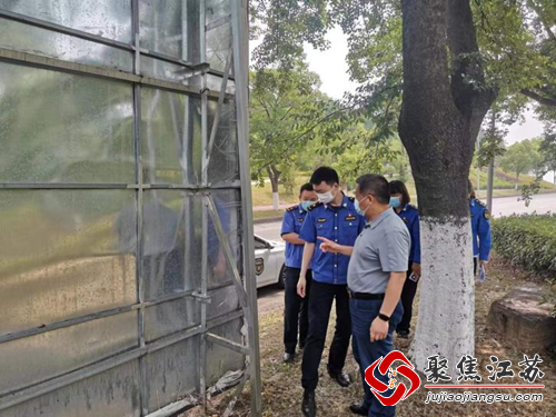 今日上午江宁区城管局结合《区城管局关于贯彻落实十五条硬措施和安全生产大检查的通知》要求对汤山街道户外广告设施进行安全管理情况调研,城管局副局长徐文成与汤山城市治理中队负责人岳建进行了现场查看与交流。