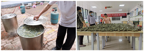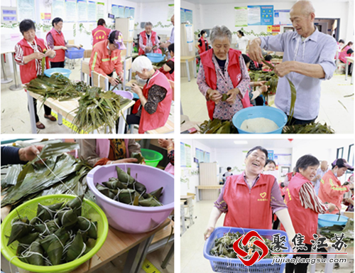 其中,有一对恩爱夫妻也参与包粽子活动中,你来包我来捆,夫妻合作地非常默契,从这包粽子的点点滴滴里就能看到两位老人充盈着的幸福感。