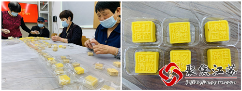 活动开始前,志愿者将不同绿豆糕面团摆放在桌上,并将一次性手套、模具、包装盒发给大家。志愿者像村民们逐一介绍各种工具和原材料,并示范制作步骤。听完讲解后大家都跃跃欲试,只见他们把糕点搓揉出形状塞进模具,经过按压一个个“中国加油”、“保持绿码”、“已打疫苗”、“体温正常”、“罩夕相处”、“核酸阴性”等字样的绿豆糕脱模成功。不仅表达了村民庆祝节日的欢愉,更是饱含着人民群众对疫情阴霾散去的美好祝愿。