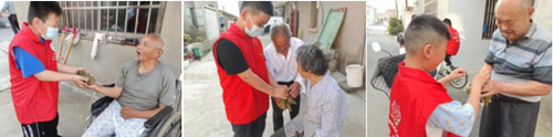 包完粽子后就到了送粽子环节,孩子们开心地穿上了红色志愿者马甲,将煮熟的粽子送到辖区内的残疾人手中,并向他们送上节日的祝福和问候。“谢谢你们,粽子很好吃。”残疾人脸上露出了幸福的笑容。
