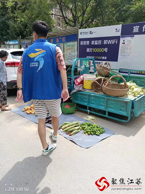 网格员李姚、王杰巡查走访定林苑内网格时发现有居民住户在小区内机动车道边摆摊卖菜,他们及时上前劝导并告知其在路口过往车辆较多存在视觉盲区,影响交通且容易发生事故,加上天气炎热户外摆摊极易中暑。在李姚和王杰的劝导下,居民自愿收摊,返回家中。