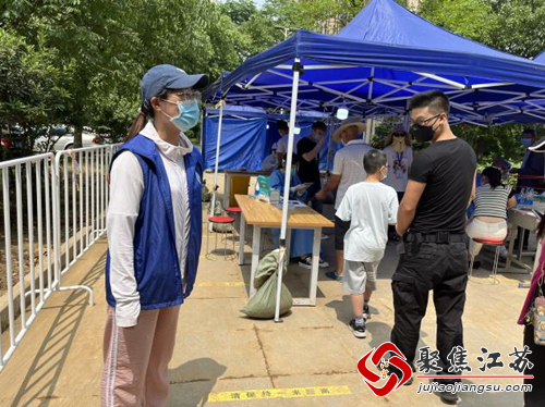 烈日当空,天气闷热,刘璐一直坚守岗位,一方面跑前跑后地联系、协调后勤物资供应事宜,另一方面维持现场秩序,提醒居民排好队,保持一米距离,同时帮助老年人操作手机苏康码和核酸检测码。汗水早已浸透了刘璐的衣服,但她依旧认真的对待居民,细致、耐心的进行引导工作,一直持续到核酸检测结束。