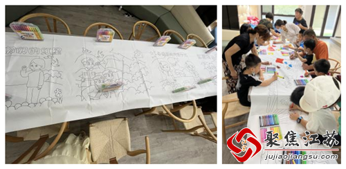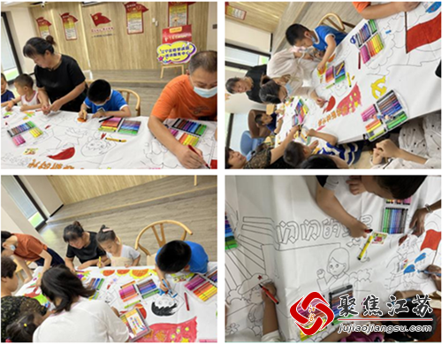 随后,孩子们和家长一起给一长幅红色画卷填色。在填色过程中,孩子们知道了党旗是中国共产党党旗为旗面缀有金黄色党徽图案的红旗;中国共产党党徽为镰刀和锤头组成的图案;认识了少先队队徽,中国少年先锋队队徽是中国少年先锋队使用的标志,由五角星加火炬和写有 “中国少先队”的红色绶带组成;更深刻地了解了红船故事。志愿者鼓励小朋友们爱党爱祖国,好好学习争当新时代好少年。