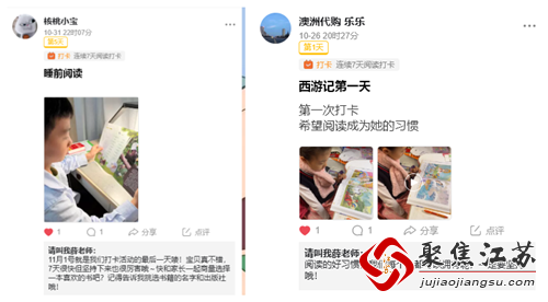 在打卡活动过程中,家长根据社工打卡示例进行打卡,有的家长上传了阅读视频,有的家长上传了阅读照片,展示了社区儿童阅读的良好精神面貌。