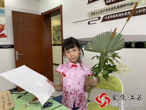 活动室里欢声笑语,桌上摆着各种材料,等待孩子们用巧手创作不一样的作品。孩子们去花园里采摘新鲜的艾草叶、棕榈叶等,用五彩绳一圈圈缠绕在艾草上面,挂上象征福气的小葫芦。