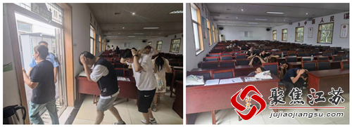 接下来是本次演练的重头戏——地震逃生现场演练。在信息员发布地震信号后,所有参会人员迅速停止活动,立即采取避险措施。高庄社区安全员充当演练负责人,迅速通知大家“地震来了,不要慌”,并指挥大家迅速采取卧桌躲避的动作,最后一排的人员则面向墙壁蹲于墙角处。