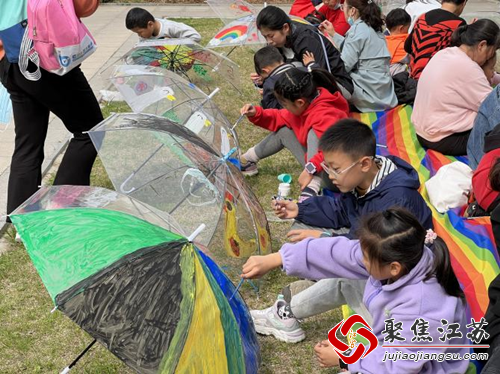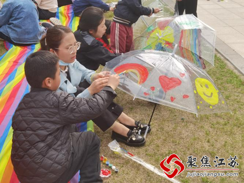 双岗社区还邀请到了美术老师来教授大家如何绘出春天中的绿色,让大家更好地体验春天的美好。在老师的悉心指导下,亲子们齐力创作亲手描绘,将这一瞬的春意留在了伞面上。本次活动温馨的氛围还吸引了社区内许多围观亲子的参与。十几位孩子作品的灵感来源与巧思各不相同,有画小鸭、小鸡、恐龙的,也有画云朵、彩虹的。最后,孩子们一同展示了各自的伞面创作并合影留念,将这一段美好的回忆永远留存在相册中。