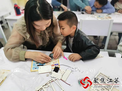 孩子们在志愿者老师的指导下开始拼装,拆开包装,拿出螺丝刀、螺丝钉、电池等零件,按照步骤组装在一起,大家也在组装的过程中,感受科学、体验科学,收获满满。