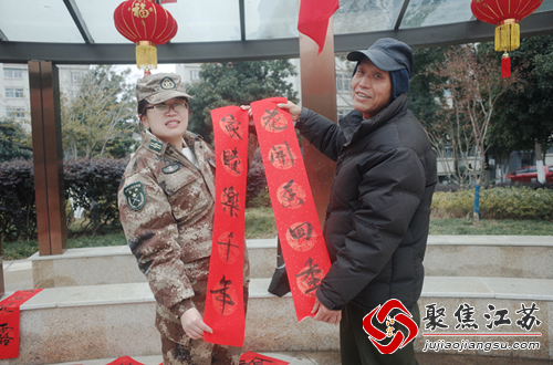 活动现场,社区党员志愿者挥毫泼墨,将一句句祝福语送给在场的居民,“一帆风顺年年好、万事如意步步高”、“ 花开香四季,家睦乐千年”,一张张春联满怀着社区对居民的新春祝福。社区给在场的退役军人送上春联,对于没空来现场领取春联的退役居民,社区还主动上门送上年画与祝福。
