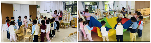 接着志愿者通过儿歌《小青蛙找家》音乐律动:“一只小青蛙,要呀要回家,跳跳,呱呱,跳跳,呱呱……小青蛙回到了家,呱~”宝贝们用拍手、拍肩、跺脚等肢体动作表现小青蛙可爱的形象,感受小青蛙找到家的快乐。