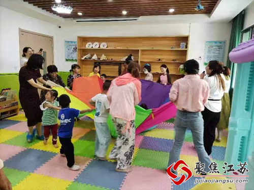 活动中还穿插了彩虹伞和膝上童谣环节,通过五彩的伞浪和朗朗上口的童谣,既锻炼了孩子们的视觉追踪能力,又增进了亲子间的情感交流。