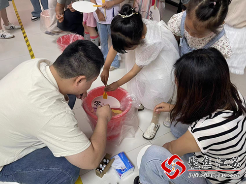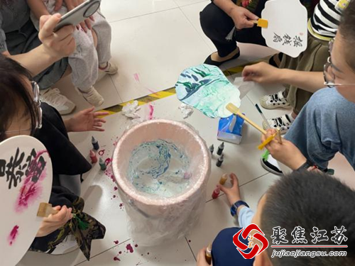 随后,活动进入了最受欢迎的环节——漆扇制作。孩子们纷纷动手挑选自己喜欢的色彩,滴在水桶中,用木棍轻轻搅动,让色彩在水中晕染开,将自己的创意与想象融入其中。在工作人员的指导下,孩子们小心翼翼地将扇面浸入水中,让扇子均匀裹上染料,看着色彩在水面上交织、流动,形成各种独特的图案。一把把色彩斑斓的漆扇在孩子们的巧手下应运而生,充满了童真与创意。