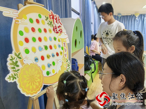 活动当天,现场热闹非凡,各式各样的中秋元素装饰将现场装点得如诗如画。趣味签到处小朋友用稚嫩的小手写下自己名字与美好祝福。领取到互动卡片后,小朋友们和爸爸妈妈们一起玩得不亦乐乎。趣猜灯谜、古风投壶、接龙古诗,这些游戏让大家都变成了小小文化探索家。每通过一个游戏关卡,就像是解锁了一个小宝藏,集齐印章后,孩子们兴奋地跑去兑换那些超级可爱的益智玩具,脸上洋溢着满满的成就感和快乐。