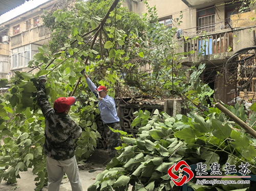 近日,栖霞区栖霞街道江南水泥厂社区网格员在巡查过程中,发现红旗一村一户长期无人居住的居民家中,一楼院落中的树枝和滕蔓已生长过度,不仅遮挡住了院落,甚至影响到了上方的电线,存在明显的安全隐患。为确保居民安全,社区党员、网格员迅速行动,积极联系房主,展开了一场联合清理行动。