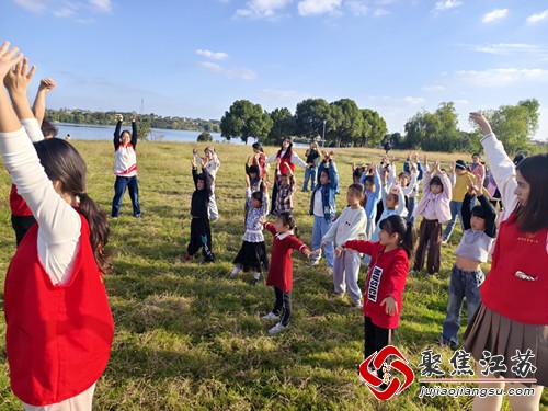 不仅如此,为了向小朋友们传递“健康运动”的重要观念,志愿者老师还引领儿童们来到室外草坪,教授他们“五禽操”。家长们也积极参与其中,共同享受这次充满意义的亲子互动时光。