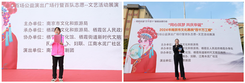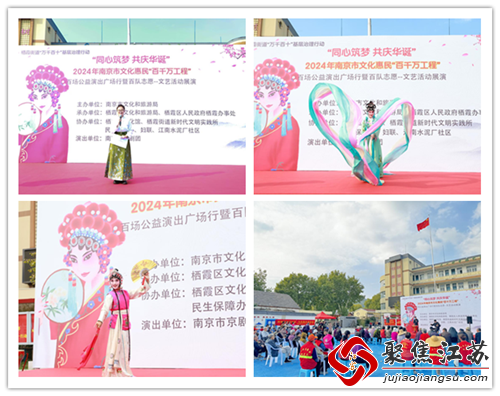 为丰富居民群众精神生活,弘扬中华传统戏曲文化,增强社区认同感和凝聚力,助力推动栖霞街道“万千百十”基层治理行动走深走实,10月31日下午,由南京市文化和旅游局主办,栖霞区文化和旅游局、栖霞区人民政府栖霞办事处承办,栖霞区文化馆、栖霞街道新时代文明实践所、民生保障办、妇联、江南水泥厂社区协办的“同心筑梦 共庆华诞”2024年南京市文化惠民“百千万工程”百场公益演出广场行暨百队志愿—文艺活动展演在江南水泥厂社区五韵广场顺利举办。