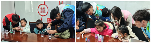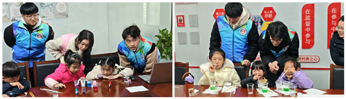 活动伊始,在志愿者的指导下孩子们进行了“自制起泡胶”实验,孩子们将胶水、硼砂水等材料按照特定比例混合,不一会儿,原本黏稠的液体逐渐变得富有弹性,变成了一团富有趣味的起泡胶。孩子们兴奋地观察着材料的变化,纷纷动手揉捏,感受科学带来的神奇体验。