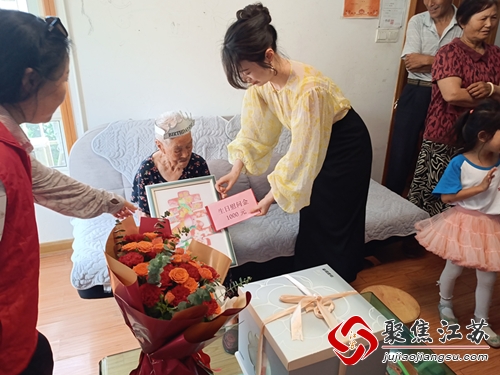 上午9:30,由社区工作者、社区慈善基金及为老为小公益服务组织成员、青少年、志愿者等15人组成“敬老先锋队”,手捧鲜花、蛋糕与满载祝福的贺寿礼盒轻叩家门。当房门开启的瞬间,百岁老人及其家人眼中漾开的惊喜与感动,让夏日的阳光都变得格外温煦。