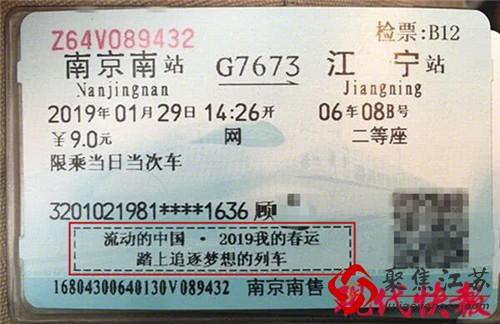 " 流动的中国 ?2019 我的春运 踏上追逐梦想的列车 "。1 月 29 日上午,南京南站候车大厅的自助取票机前,不少乘客发现,火车票上多了这样两行字。这就是当天,中国铁路上海局集团有限公司联合现代快报,在南京独家发行的 2019 年春运 " 追梦款车票 "。