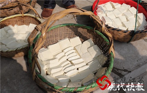 一大早,句容市后白镇曹村的谢载生家里就挤满了来磨豆腐的村民,十分热闹,整个屋里都弥漫着一股浓郁的豆香味,村民们带着一桶桶泡好的黄豆排队等待。80岁的老太方世英表示,她一大早吃完早饭就拎着8斤泡好的黄豆来排队了,在她看来,过年吃豆腐是中国人的老传统,是有讲究的,“豆腐、豆腐,‘都富’,一家人一年到头就要磨豆腐都要富,是风俗。”
