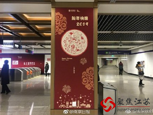 南京地铁车站里也张灯结彩,春联、窗花、灯笼、中国结全都上了墙,洋溢着浓浓的节日氛围。