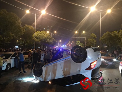 (通讯员 孙国武 记者 万凌云)17日晚,丹阳闹市区出现罕见一幕,一辆轿车因操作失控,竟然倒扣在闹市路面中央!
