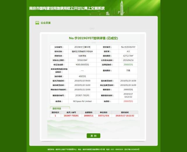 摘要:5月21日,南京建邺区河西南1号地块成功出让,这是一幅科教用地,项目内容是电商服务平台,起拍价2亿元。