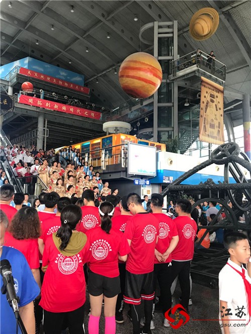 科普定向挑战赛刚一结束,随着一曲《我和我的祖国》旋律响起,人们陆续往南京科技馆场馆序厅集结,一场由科技工作者、科普志愿者、退休干部群众和市民游客参与的快闪活动吸引了来馆参观游客们的围观,人们纷纷驻足停留,有的不由自主地跟着音乐唱出声来,有的则拿出手机拍照、录像、转发朋友圈。人们通过歌唱祖国表达对祖国的热爱之情深深感染了现场的每一个人。