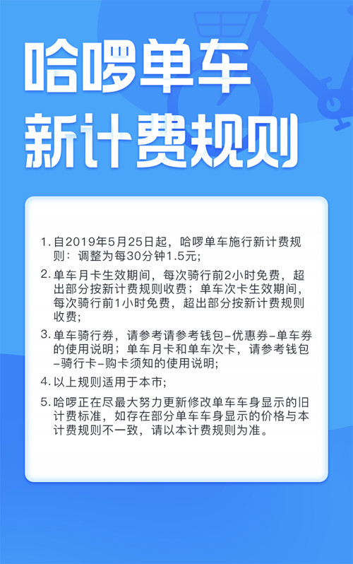 5月25日,打开哈啰单车APP,在界面上方,可以看到一行醒目的“单车计费新规则5月25日起实行”,点开就可以看到,自5月25日起,哈啰单车调整为每30分钟1.5元;次卡、月卡用户维持原有1小时、2小时免费时长不变。