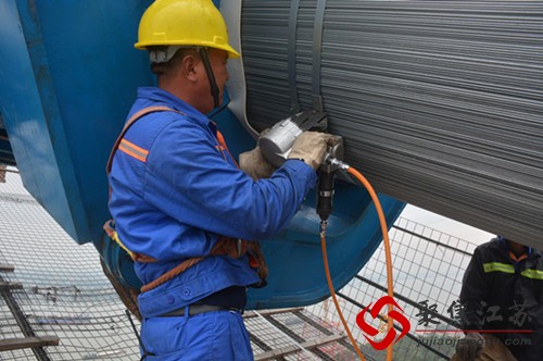 现场技术负责人王瑞告诉记者:“主缆紧缆施工过程技术控制要素多、技术参数控制要求精度高。为保证紧缆质量,现场在紧缆时每间隔1米挤紧1次,挤紧后立刻在挤紧器旁安装2根钢带箍紧,并对该处主缆的周长和直径进行测量并记录,保证质量万无一失。”