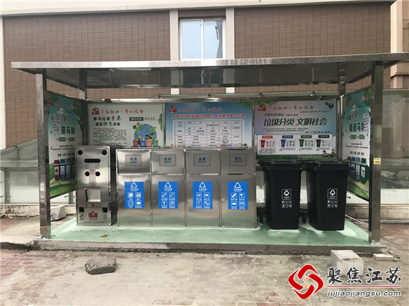 崭新的垃圾分类亭里,从左至右分别规范摆放着七个分类箱,依次是有害垃圾、金属、纸类、塑料、玻璃、其他垃圾回收箱,同时在醒目位置张贴了垃圾分类宣传板,上面标明了城市生活垃圾的种类以及居民生活垃圾分类与投放注意事项。指引居民到收集点投放垃圾,从自身做起,正确进行垃圾分类,积极参与到垃圾分类的行动中。