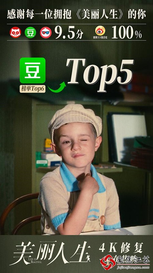 此次《美丽人生》以4K修复的全新面貌在中国上映,以全平台9.5的神级评分成为同档期口碑冠军。这部诞生于1997年的经典,丝毫不过时。“看多少次都会让人充满触动的电影!”,“不看这部电影,你的人生不完整”,“一生一定要看一次的电影”……《美丽人生》之所以能在上映当年横扫包括奥斯卡最佳外语片、最佳男主角以及戛纳电影节评审团大奖等数十项国际奖项,正是因为它的感动跨越国界。时至今日,《美丽人生》继续创造着新的感动。