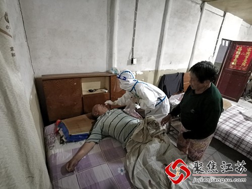 老人躺在床上,配合着医护人员的工作,他的孙子此刻正在外面为了国家为了民众不顾艰难险阻的奋力拼搏,现在,就让国家和工作人员来保护行动不便居住在家的爷爷。