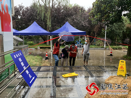 台风让骤雨来得频繁,在果场社区核酸检测点,许多老年居民避之不及。检测点机动组的志愿者们快速铺上防滑草垫,正好看见一位老奶奶步履蹒跚,未能进入检测点设置的避雨场馆内,志愿者和工作人员立即撑伞上前,将老人带入场馆内避雨,摄影记录下了党员志愿者们未其撑伞的画面,而他们自己却很快被雨水打湿。