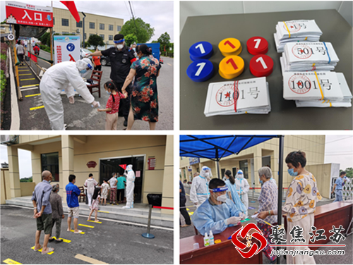 村民在入口处检测体温、查验苏康码后方可进入“锻炼式”排队通道,通过钢管架构、地面张贴一米线的方式将距离拉开,不仅防聚集还能锻炼身体,最后到达取票处领取“核酸检测号码牌”,通过叫号分流的方式安排村民进入检测等候区,领取我们的四色号码牌,根据手上号码牌的颜色站在红黄蓝绿四色通道处等候检测,10 人一组进行排队,并按照手举红黄蓝绿四色指示牌引导员的引导一人一号一队,前往对应颜色检测窗口凭号进行登记和检测,检测完成后迅速离场,整个过程有条不紊。