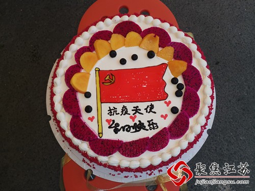 因为疫情的原因,生日临时安排在村卡口的小帐篷里面,桌子上面的蛋糕画着一面党旗,下面用巧克力写着“抗疫天使,生日快乐”。